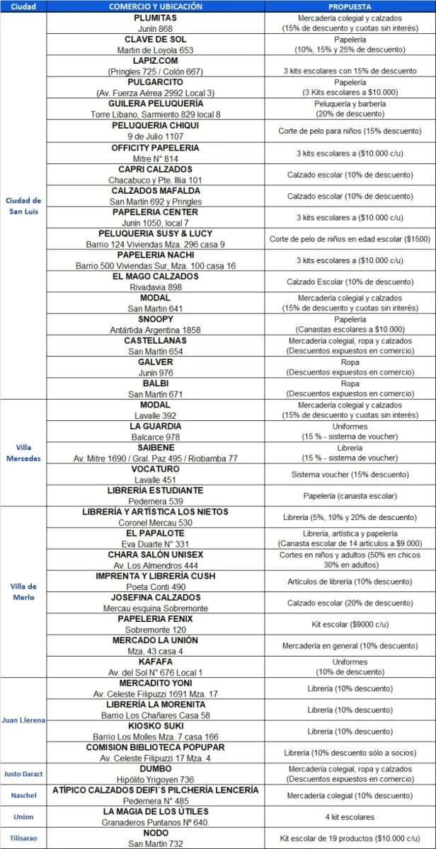 El Gobierno Provincial lanzó una iniciativa del 5 al 10 de febrero, y otra, todavía tentativa, del 26 de febrero al 2 de marzo, para la adquisición de bienes y servicios con vistas al comienzo del ciclo lectivo. En Merlo adhieren ocho comercios que ofrecen descuentos, canastas y kit escolares, como también bonificación en uniformes.