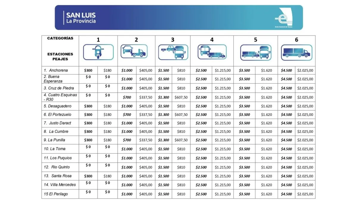 Con la actualización, la tarifa para autos quedará en $1.000 en todos los peajes con excepción de La Punilla, El Portezuelo y Cuatro Esquinas (ruta N°30) donde el valor será de $700.
