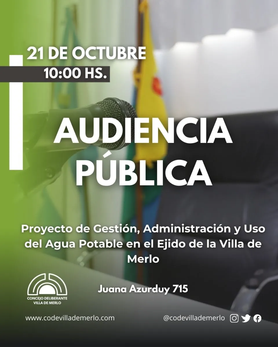 El Concejo Deliberante de Villa de Merlo anunció la apertura de inscripciones para la Audiencia Pública en la que se discutirá el Proyecto de Gestión, Administración y Uso del Agua Potable dentro del ejido municipal. Este evento busca dar participación a la comunidad local, brindando un espacio para que los vecinos expresen sus opiniones y propuestas respecto a un recurso esencial para la vida en la región.