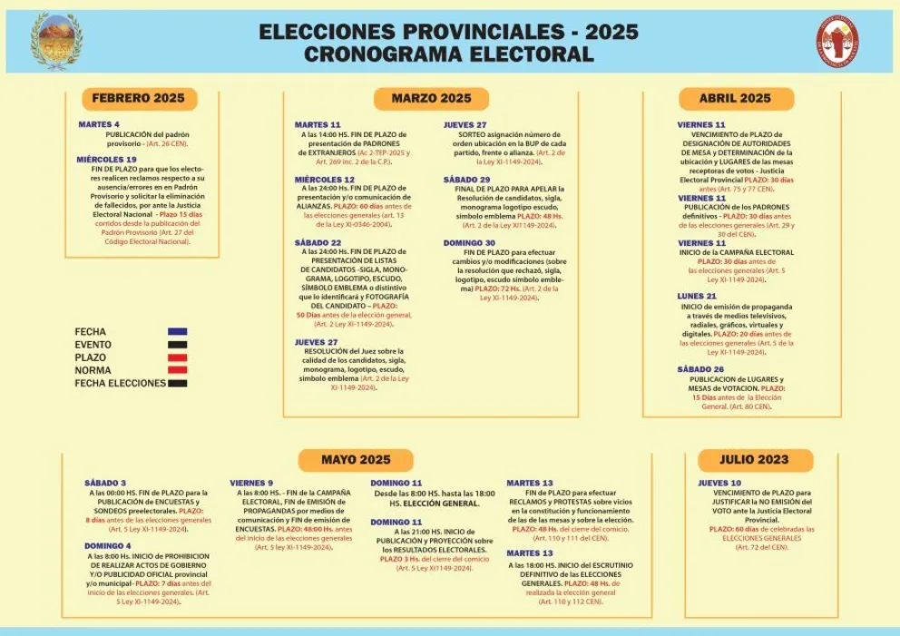 - Sábado 22: Fin del plazo para la presentación de listas de candidatos, que incluye sigla, monograma, logotipo, escudo, símbolo, emblema o distintivo que los identifique, así como la fotografía del candidato. Este plazo corresponde a 50 días antes de la elección general, según el Artículo 2 de la Ley XI-1149-2024.