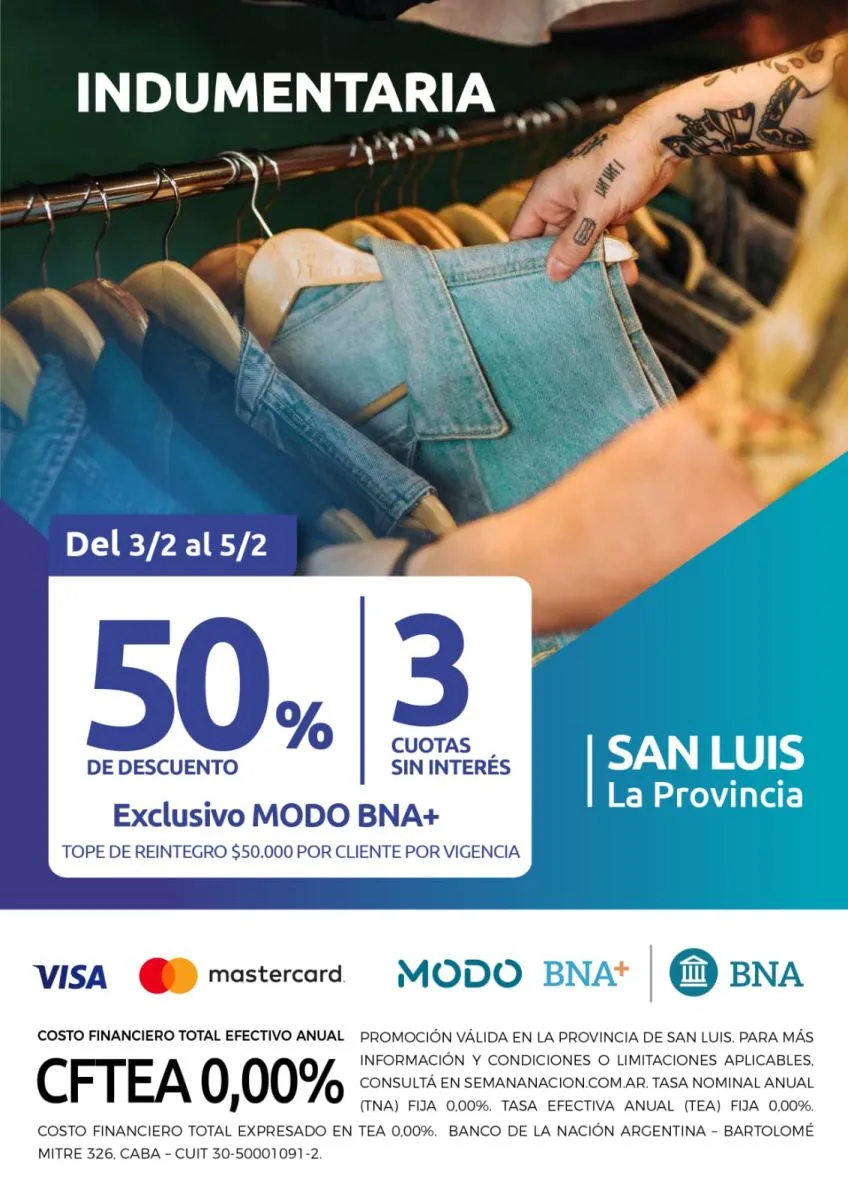 A partir de este lunes 3 de febrero y hasta el miércoles 5 inclusive está vigente la promoción del banco Nación en todo San Luis para compra de indumentaria y calzado con 50 por ciento de descuento. El beneficio aplica a través de MODO con tarjetas de crédito VISA o Mastercard, en 3 cuotas sin interés y un tope de reintegro de 50 mil pesos.