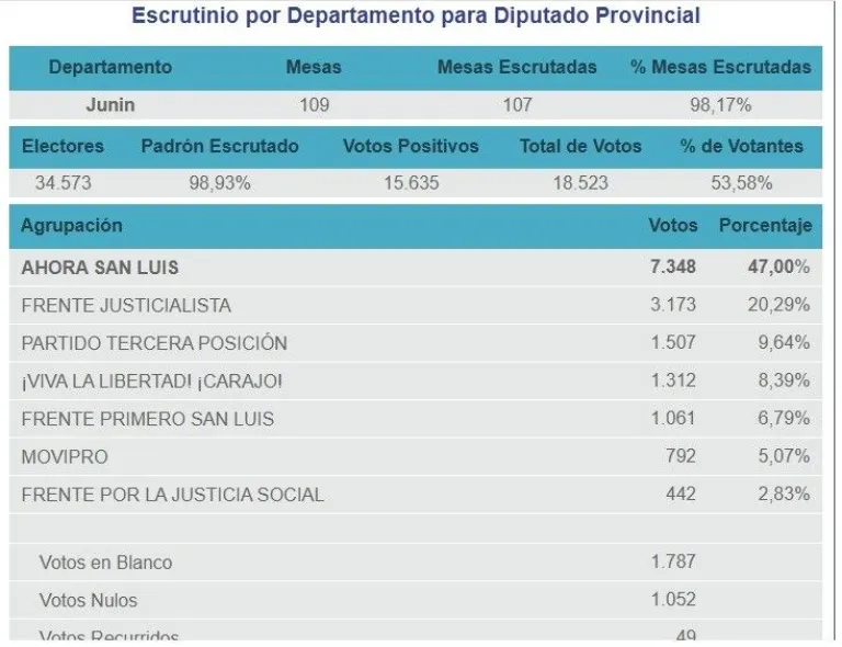 Ahora San Luis se alzó con un claro triunfo en el departamento Junín. Y esa contundencia se reflejó en las dos bancas para diputados provinciales alcanzadas. Gabriela Mancilla (Avanzar) irá por su segundo mandato y debutará como legislador el radical de Merlo, Bruno Miní. Ahora San Luis sumó 7.348 votos (47%). Por el Frente Justicialista fue electo, Walter Pollo, que alcanzó los 3.173 votos (20,29%) que ocupará una banca como diputado provincial a partir del 10 de diciembre.