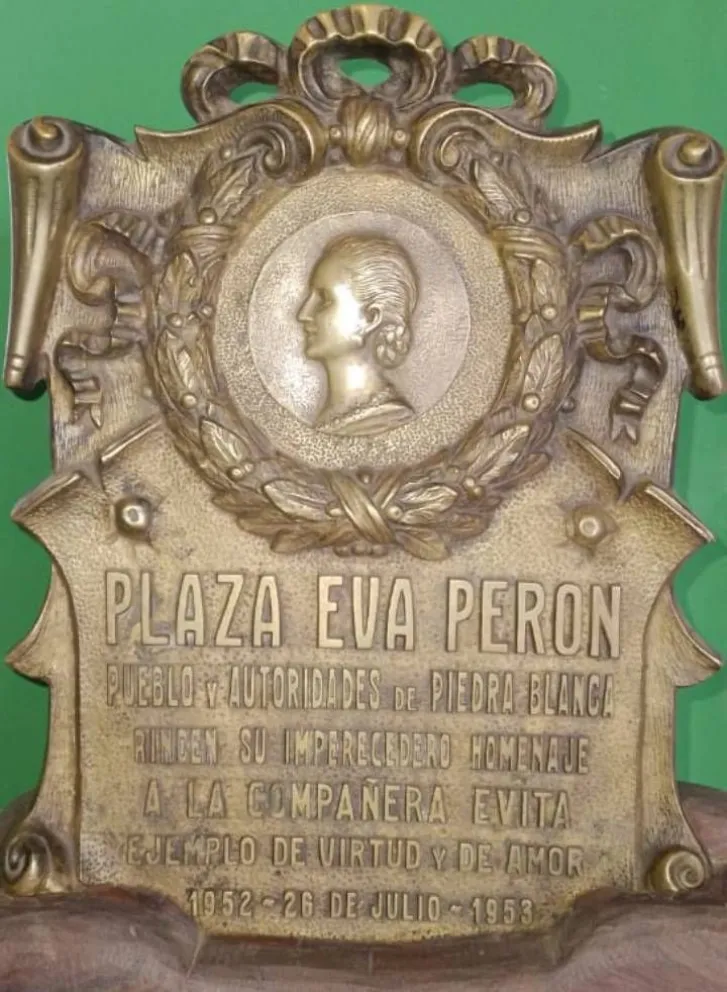 La placa recordatoria colocada en la plaza de Piedra Blanca en 1953, a solo un año de la muerte de Evita, lleva la inscripción "Plaza Eva Perón. Pueblo y autoridades de Piedra Blanca rinden su imperecedero homenaje a la compañera Evita. Ejemplo de virtud y de amor". Esta placa fue encontrada y rescatada por un vecino del Barrio San Carlos de Merlo y editor de la Revista "Conlara Hoy" Cacho "Chino" Charra, y posteriormente fue expuesta en la Casa del Bicentenario durante la gestión de Miguel Ángel Rody Flores y Gloria Petrino. Después del 2020, la pieza hecha en bronce fue rescatada en un depósito municipal y entregada a la sede de ATE, donde actualmente se encuentra.