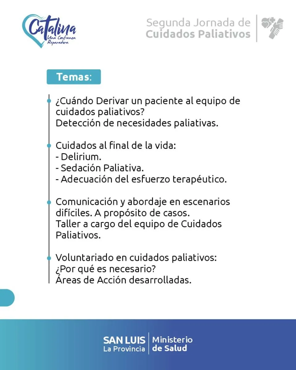 En el marco del primer aniversario de su Unidad de Cuidados Paliativos, el Hospital Madre Catalina Rodríguez desarrollará una jornada de formación teórico-práctica dirigida a profesionales de salud de todo el Valle del Conlara.