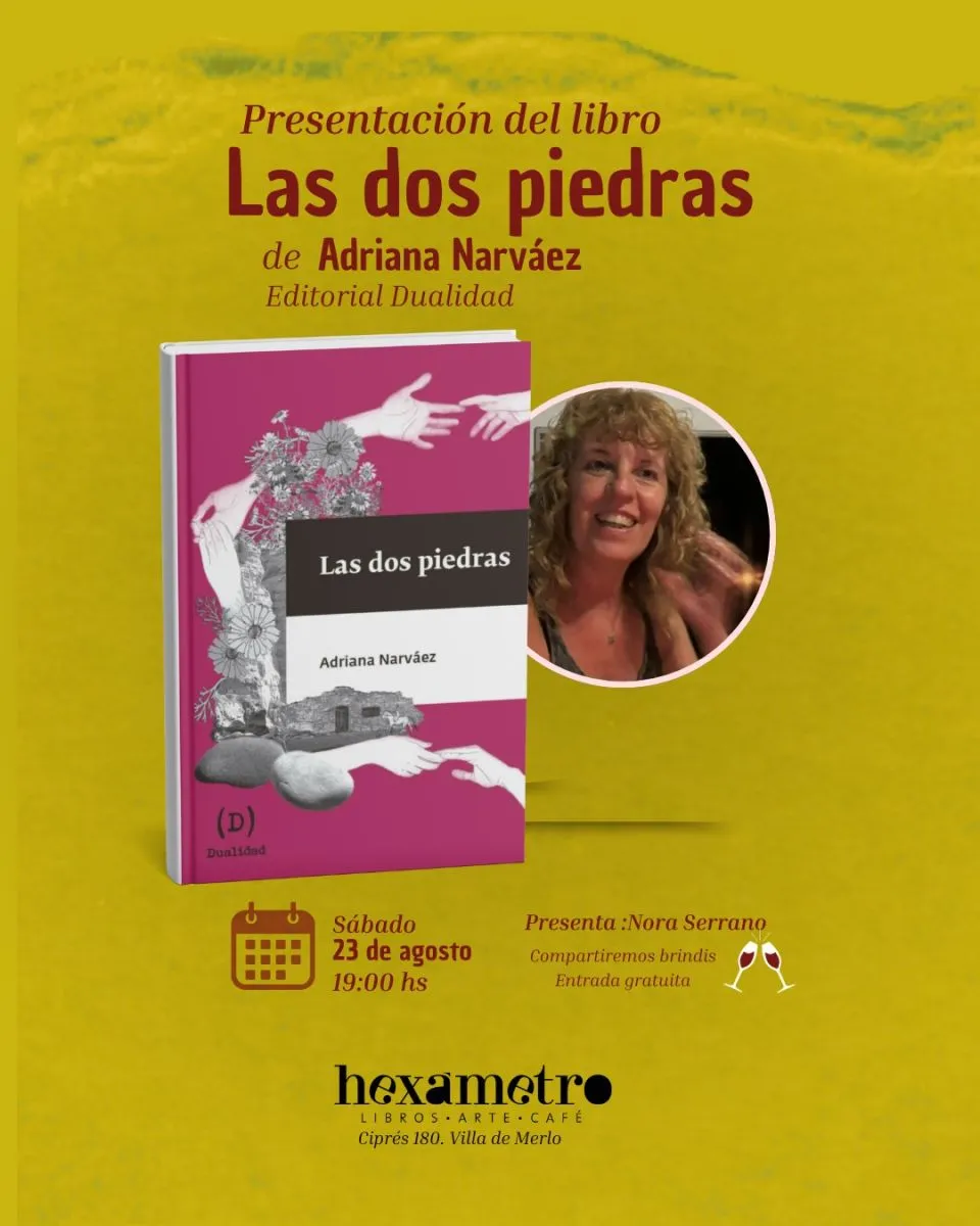 El sábado 23 de agosto a las 19 en la librería Hexámetro (El Ciprés 180) se presenta la novela “Las dos piedras” de Adriana Narváez, publicada por Editorial Dualidad. Durante el encuentro, la escritora estará acompañada por Nora Serrano para conversar sobre la obra. Luego, habrá brindis y firma de ejemplares con dedicatoria por parte de la autora. La entrada es libre y gratuita.