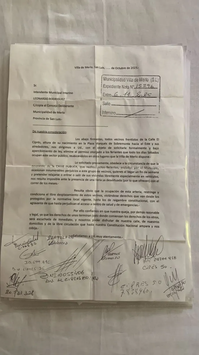 Más de veinte frentistas de calle El Ciprés, entre Becerra y Pringles, presentaron una nota formal ante el Municipio para solicitar que se deje sin efecto el permiso que autoriza la instalación de la feria de los sábados sobre esa arteria. Los vecinos piden que la actividad sea relocalizada en un espacio adecuado, sin afectar la circulación vehicular ni el acceso a los domicilios.