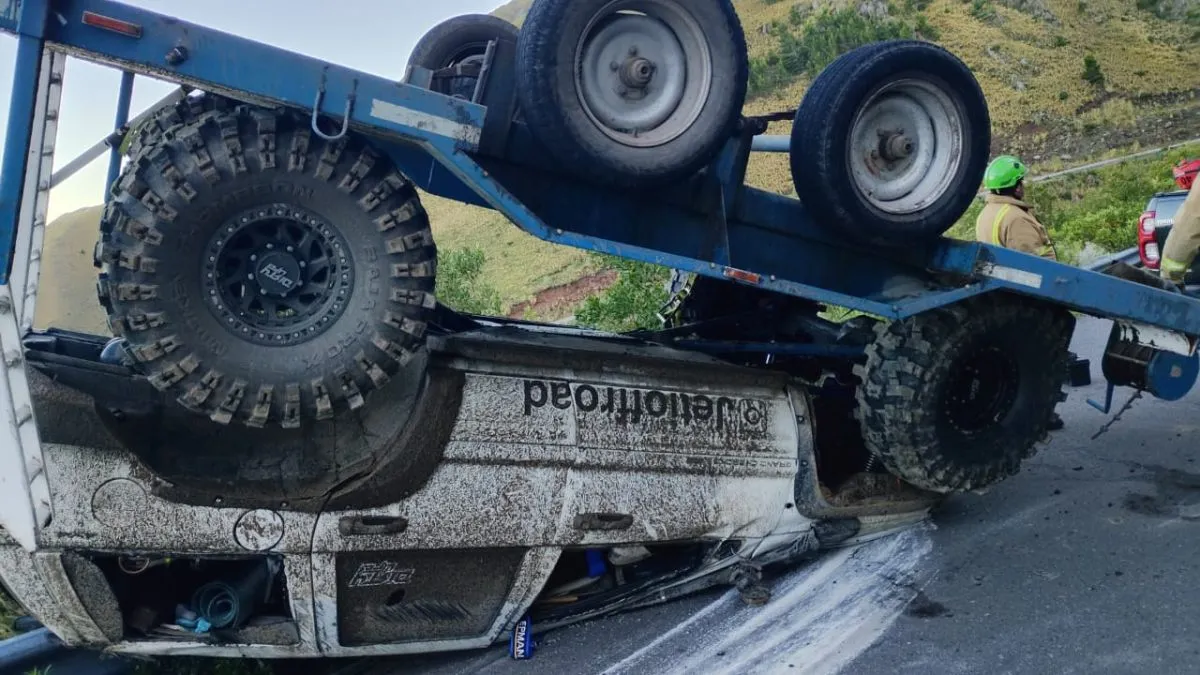 Una camioneta Toyota Hilux que remolcaba un vehículo todo terreno perdió el control y el tráiler terminó volcado sobre la calzada. Ocurrió este sábado por la mañana. Los dos ocupantes, oriundos de Buenos Aires, resultaron ilesos.