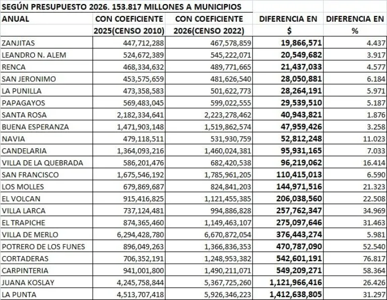 En el caso de Villa de Merlo, los datos muestran un incremento significativo en los recursos proyectados para 2026.