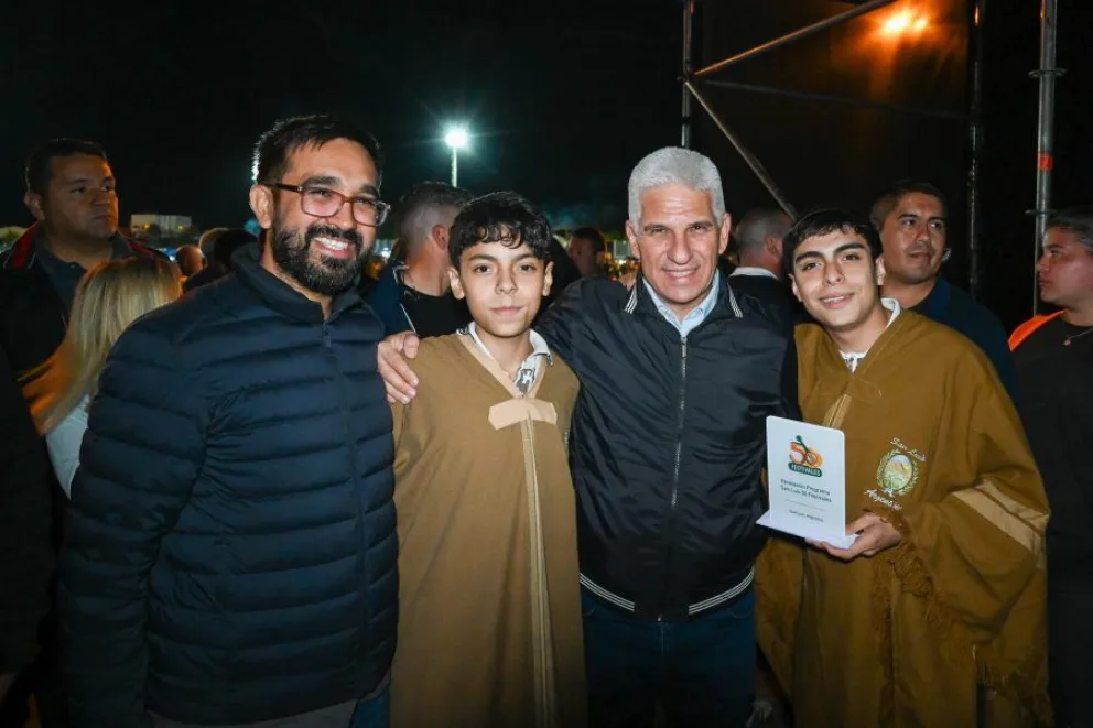 Pasadas las 20:00, el Primer Mandatario fue recibido por el ministro de Turismo y Cultura, Juan Álvarez Pinto, y el intendente de Potrero de los Funes, Ignacio Olagaray. Cuando atravesó el costado del escenario para integrarse al público, los integrantes de La Cautana le saludaron e invitaron a los presentes a entonar el ‘grito cuyano’.